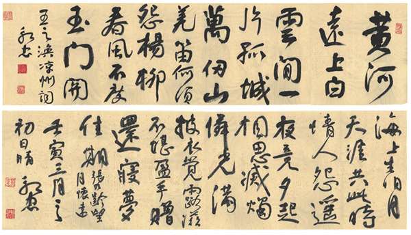 在《茆永忠书法作品》(第二卷)中,编选了他的书法精品力作15 幅,分别为:1.宋·戴复古《登快阁黄明府强使和山谷先生留题之韵》诗句行书楹联;2.唐·张九龄《感遇·江南有丹橘》《望月怀远》行书长卷;3.《长虹明月对联》行书楹联;4.唐·孟浩然《夜归鹿门歌》《夏日兰亭怀辛大》行书长卷;5. 唐·崔颢《黄鹤楼》行书横幅;6.唐·孟浩然《与诸子登岘山》《宿业师山房待丁大不至》行书长卷;7. 唐·王之涣《凉州词》二首·其一行书横披;8.唐·孟浩然《宿建德江》/ 唐·王维《杂诗》三首·其二行书长卷;9. 唐·王维《鹿柴》《相思》行书长卷;10.《为乐去古联》楷书楹联;11.唐·王翰《凉州词》二首·其一/ 唐·王湾《次北固山下》/ 唐·王昌龄《出塞》二首·其一行书长卷;12. 唐·王维《渭川田家》行书长卷;13.《公则生明,廉则生威》行书横披;14. 唐·韦庄《台城》/ 唐·李商隐《登乐游原》行书长卷;15.《水墨丝桐对联》行书楹联。其中除4 幅竖写的楹联外,大多书作为行书横披或长卷形制。在茆永忠笔下的横幅作品,由右首起笔向左横向展势,或如闲云野鹤,饶有林下之风,或如铁骑突出,出之长枪大戟笔法,幅幅作品无不显其胸有成竹、气盛神凝,信笔而书,字形开张多变,笔力拙劲雄肆,收放自如,气势浩然,是颜体阔达大度的结构特点的呈现。其作品如大将布阵,从容自若,任情挥洒,以疏朗有致的章法、挺秀流丽的风神、变化多端的笔致、纵横自如的取势,成就了一种“不激厉,风规自远”的书风而令人叹为观止。