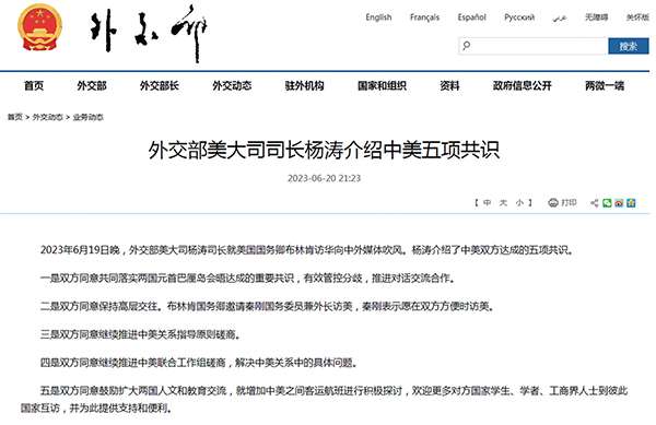 2023年6月19日晚,外交部美大司杨涛司长就美国国务卿布林肯访华向中外媒体吹风。杨涛介绍了中美双方达成的五项共识。