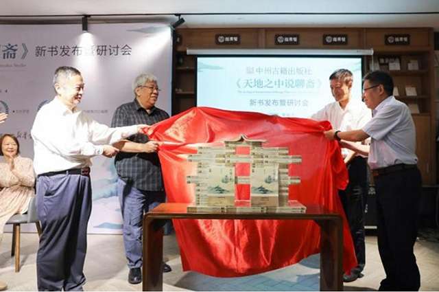 中原大地传媒股份有限公司副总编辑郭孟良、鲁枢元老师、黄河科技学院副校长于向东、河南师范大学副校长马治军一起为本次发布会的新书《天地之中说聊斋》揭幕。