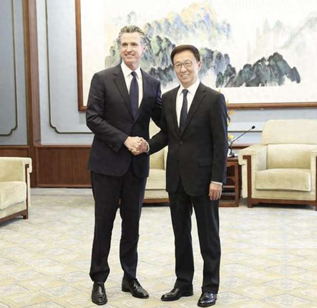 韩正表示,中美关系是当今世界最重要的双边关系,尽管经历一些风雨,但合作始终是主流。近期中美关系出现止跌企稳势头,中美两国政府、社会各界和地方应该加强沟通、交流与合作,共同推动中美关系实现健康稳定发展。上海等地同加州的合作是中美地方交往的典范,未来发展潜力巨大。希望纽森州长此访为促进双方交流合作、改善发展中美关系注入正能量。
