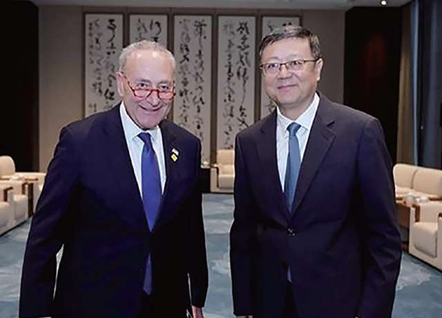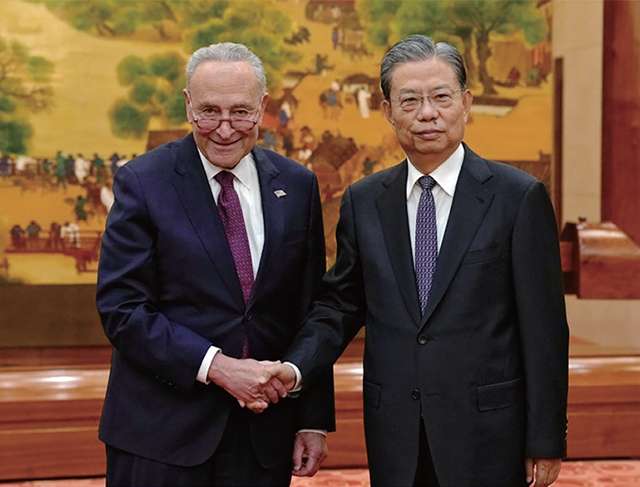 2023 年10 月9 日,全国人大常委会委员长赵乐际与美国国会参议院多数党领袖舒默合影。