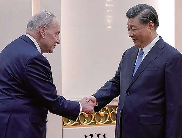 2023 年10 月9 日,中国国家主席习近平在北京人民大会堂会见美国国会参议院多数党领袖舒默。