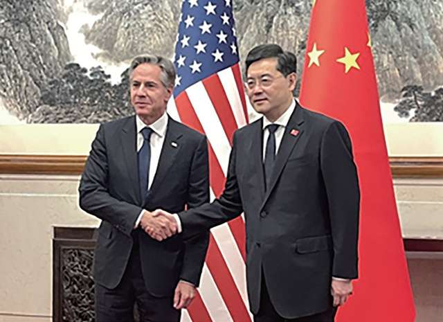 2023 年6 月18 日,国务委员兼外长秦刚在北京会见美国国务卿布林肯。
