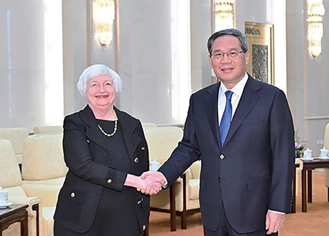 2023 年7 月7 日,国务院总理李强在北京人民大会堂会见美国财政部长耶伦。