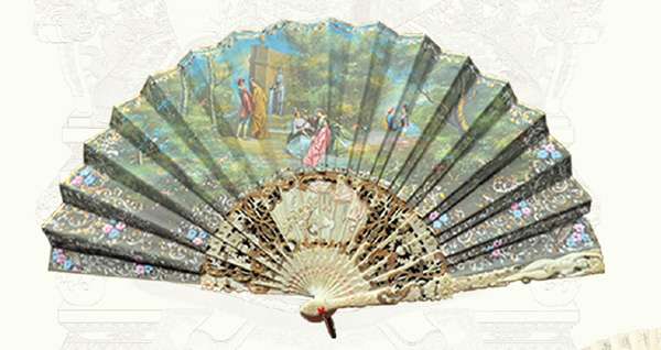 十六世纪出口西班牙,象牙扇骨,大骨雕刻人物,小骨镂空雕刻描金,纸面双面绘画艺术折扇(杭州舒莲记扇庄藏)