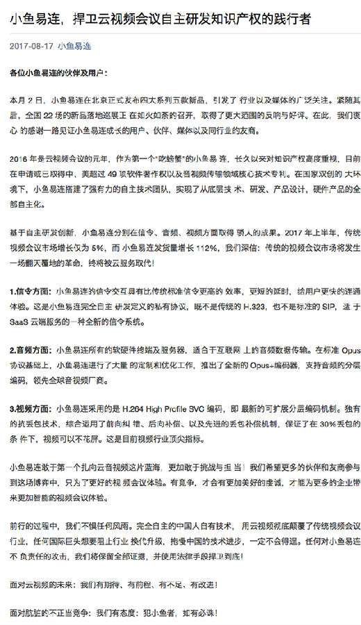 从业务上说,小鱼易连的业务形态与Polycom宝利通有一定的相似性,都是视频会议设备,但实现方式几乎完全不一样。小鱼易连的云视频会议与宝利通的视频会议几乎是两个时代的产品,就好像马车进化到汽车,如果说汽车抄袭了马车,那就真的要让人笑掉大牙了,虽然他们都能跑。