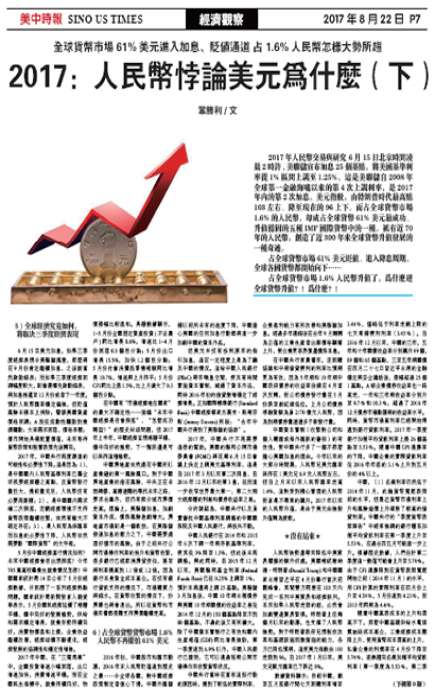 2017年人民币交易与研究 6月15日北京时间凌晨2时许,美联储宣布加息25个基点,将美国基准利率从1%区间上调至1.25%。这是美联储自2008年全球第一金融海啸以来的第4次上调利率,是2017年内的第2次加息。美元指数,由特朗普时代最高点103左右、降至现在的96上下。而占全球货币市场1.6%的人民币,却成占全球货币61%美元最成功、升值稳固的五种IMF国际货币中的一种。只有近70年的人民币,创造了近300年来全球货币升值发展的一种奇迹。