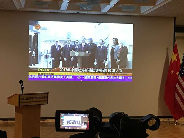 招待会期间通过一部短片总结过去的2017年。在刚刚过去的一年,中国共产党十九大确立习近平新时代的中国特色社会主义思想,过去一年中国在经济、脱贫、构建新型国际关系、推动共建一带一路等方面所取得的重大进展。特别是习近平主席和特朗普总统举行的3次会晤等,为新时期中美关系发展提供了重要的战略理念。过去一年中国和洛杉矶领区的交流与合作上有了巨大发展,访洛杉矶的游客超过110万人次,领区内的中国留学生超过5万人,南加州中国企业已超过6百家,投资超过100亿美元等。