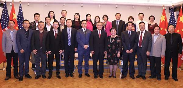 前排自右向左,洛杉矶总领事馆副总领事孙鲁山,总领事张平,副总领事庄志哲、副总领事代双明。