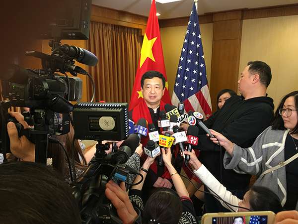 中国驻洛杉矶总领事馆文化参赞古今接受媒体采访。