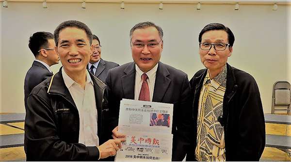 美中时报记者与张平总领事手持张平就职演说报道的美中时报合影。