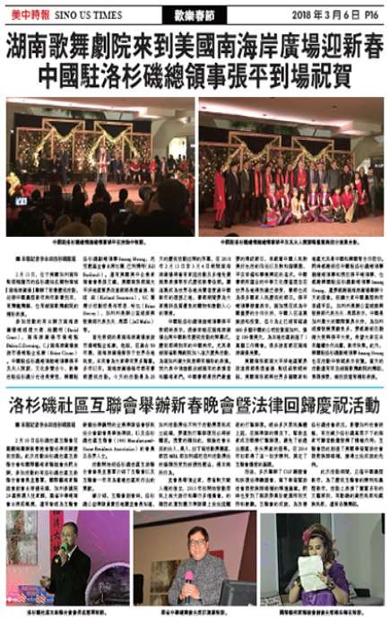 2月10日洛杉矶社区互联会在罗兰岗举办新春晚会暨法律回归庆祝活动。此次活动由杉矶社区互助联合会和国际艺术家联谊会共同主办,参加活动的有洛杉矶社区互助联合会会长孟宪军,国际艺术家联谊会创会主席杨采烨,加州参议院29区候选人沈家麒,罗省中华总商会主席庄佩源,还有曾经为互联会做个法律顾问的全美律师协会移民法分会副会长华强律师,以及洛杉矶社区互联会(1441 Manufactured-Home Residents Association)的会员及各界人士。