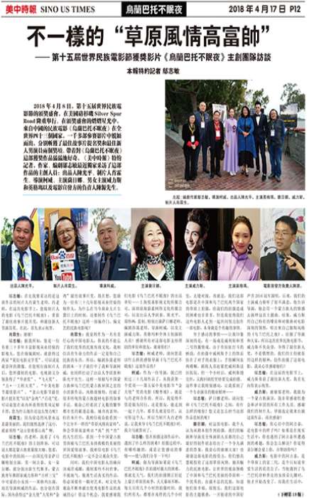 2018年4月8日,第十五届世界民族电影节的颁奖盛会,在美国硌杉矶Silver Spur Road隆重举行。在颁奖盛会的熠熠星光中,来自中国的民族电影《乌兰巴托不眠夜》在全世界四十三个国家,一千多部参赛影片中脱颖而出,分别斩获了最佳故事片提名奖和最佳新人男演员两个奖项。带着对《乌兰巴托不眠夜》这部获奖作品满满地好奇,《美中时报》特约记者,作家、编剧邬志敏最近独家采访了这部作品的主创人员:出品人陈光平、制片人肖霖生、导演柯威、主演萨日娜、男女主演威力斯和英格玛以及电影宣发方的负责人陈源先生。