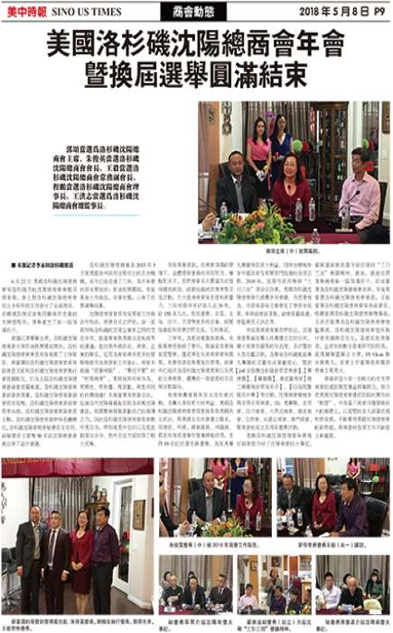 郭颂当选为洛杉矶沈阳总商会主席,朱俊英当选洛杉矶沈阳总商会会长,王毅当选洛杉矶沈阳总商会常务副会长,程鹏当选洛杉矶沈阳总商会理事长,王洪志当选为洛杉矶沈阳总商会总监事长。