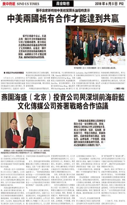 2018年6月3日,燕园海盛(北京)投资有限公司与深圳前海蔚蓝网络文化传媒有限公司在燕园海盛深圳办事处签署了影视项目融资战略合作协议。