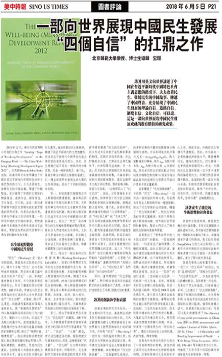 2014年12月,唐任伍教授等精心打造的扛鼎之作“Avoiding‘Traps ofMinsheng Development’ in the Changing World ——The China Well-being (Minsheng)Development Report 2012”,由美国Homa & Sekey Books 出版。该著用英文向世界讲述了中国在习近平新时代中国特色社会主义思想的指引下,大力改善民生、发展民生的中国故事,传递了中国声音,充分展现了中国民生发展的理论自信、道路自信、制度自信、文化自信。可以说,这是一部向世界展现中国民生发展成就的很有价值的研究成果。成果自出版以来,在国内外产生了很好的影响,一些研究中国民生问题的学者,要么通过邮件和通讯方式与作者进行交流联系,要么在他们的研究成果中引用作者的观点作为支撑。