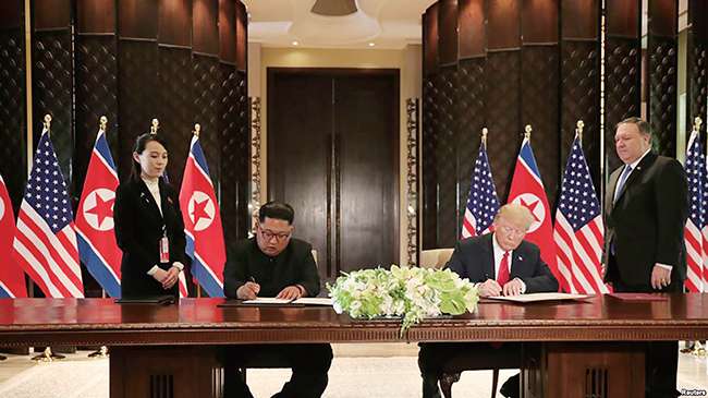 美利坚合众国总统唐纳德·J·特朗普与朝鲜民主主义人民共和国国务委员会委员长金正恩已表示致力于合作,以发展新的美朝关系并推动韩朝半岛与世界的和平、繁荣与安全。