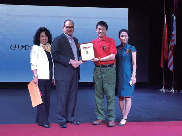 加州参议员夏乐柏(夫人何美眉翻译)向牧之教授夫妇颁发贺状。
