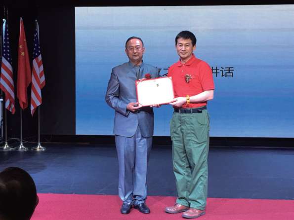 牧之教授向美中经贸文化促进会朱俊英会长颁发证书。