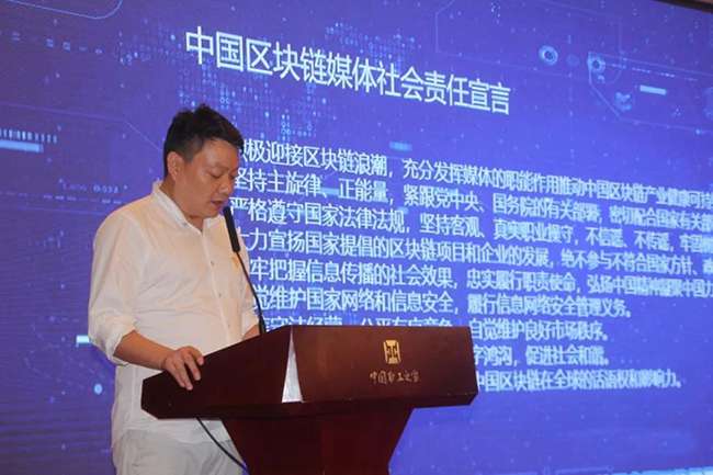 中国经济新闻联播网区块链频道副总编张桐宣读《中国区块链媒体社会责任宣言》