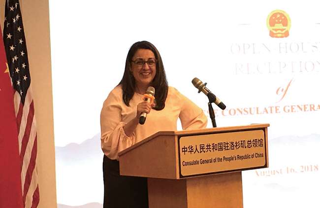 加州州立大学北岭分校助理副校长Shelley Ruelas-Bischoff博士在活动中发言感谢中国政府提供奖学金名额,帮助该校学生拓展全球视野,实现国际化发展,特别是认识到当今时代国与国之间求同存异的重要性。中美两国应不断扩大共识,缩小分歧,寻求共同发展。该校愿继续深化同中方的教育交流合作。