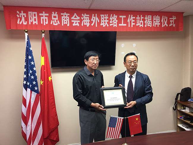 美国奉商总会翟维远副会长的企业所在PicoRivera市前市长David Armenta(右2)向沈阳市工商业联合会颁发欢迎状、