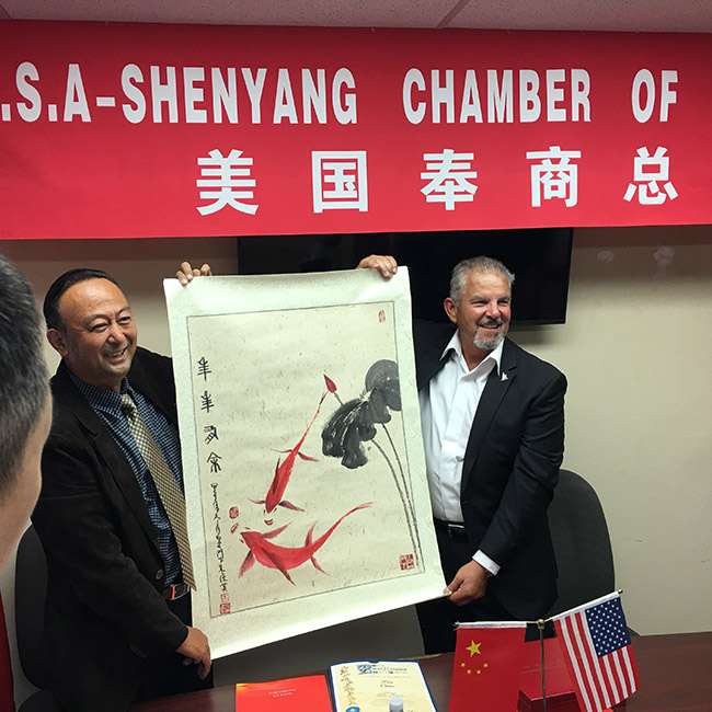 9月20日,中国沈阳市总商会经贸代表团在沈阳市工商业联合会副主席刘延民的带领下,在美国洛杉矶走访了多家美国奉商总会的会员企业。下午3点代表团首先到了坐落在洛杉矶市东南方向的Pico Rivera市的翟维远副会长的连锁企业HOMECO美家,受到了企业所在城市Pico Rivera前任市长David Armenta的热情欢迎。David介绍了该市的社会经济发展情况,欢迎中国沈阳的企业到该市投资兴业。一年前David接受美国奉商总商会的邀请曾经访问过沈阳,当刘延民副主席再次邀请David市长访问沈阳时,David接受邀请表示希望有机会再次访问沈阳。会见期间David Armenta向沈阳市工商业联合会颁发欢迎状,并且互赠了纪念品。随后,代表团一行参观了美国奉商总会的会员的美国凯泰房地产开发项目以及洛杉矶知名的奉商餐饮企业颐丰园。
