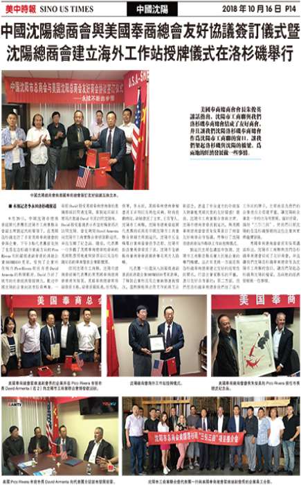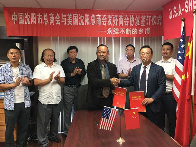 中国沈阳总商会与美国奉商总会签订友好协议互换文本。