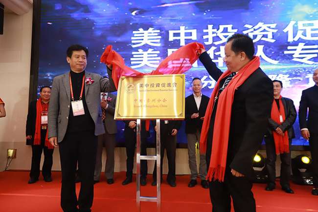 美中投资促进会副会长焦营(左)与美中投资促进会主席助理宋丰全(右)为常州分会成立揭牌。