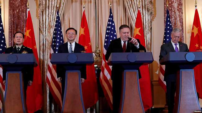 星期五,美国国务卿蓬佩奥和国防部长马蒂斯会晤了到访的中共中央政治局委员、中央外事工作委员会办公室主任杨洁篪、国务委员兼国防部长魏凤和上将。在会后的记者会上,双方代表都强调,本次会谈是坦诚的、建设性的富有成果的。蓬佩奥说,美国寻求与中国建立建设性的、以成果为导向的、互惠的和互相尊重的关系。