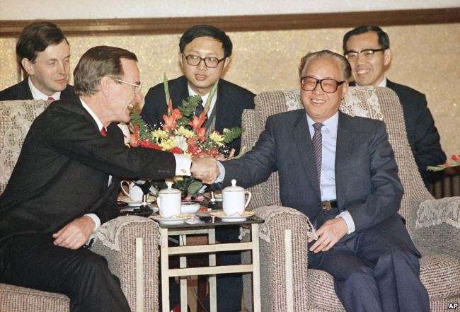 1989年2月26日,美国总统乔治·H·W·布什和中共总书记兼国务院总理赵紫阳在北京人民大会堂举行会谈时握手。