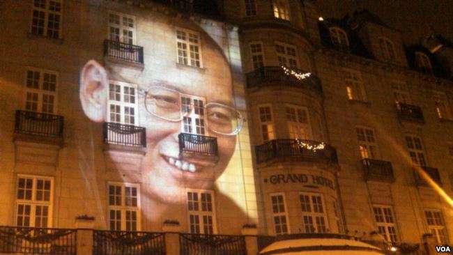 2010年12月10日,为刘晓波缺席颁发诺贝尔和平奖之夜,他的形象投映在举行诺和奖晚宴的奥斯陆大酒店的正面外墙。