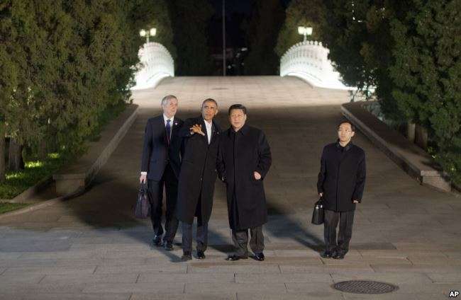 美国总统奥巴马赴中国出席亚太经合组织峰会并对中国进行国事访问。这是奥巴马第二次访华。11月11日晚,中国国家主席习近平在中南海瀛台迎接奥巴马,以月下漫步形式交谈。11月13日,奥巴马和习近平发表有关气候变化的联合声明。此后两年,两位元首又相继发表两份应对气候变化共同声明,为《巴黎气候协议》的达成奠定基础。奥巴马总统任内先后对中国进行了三次访问。