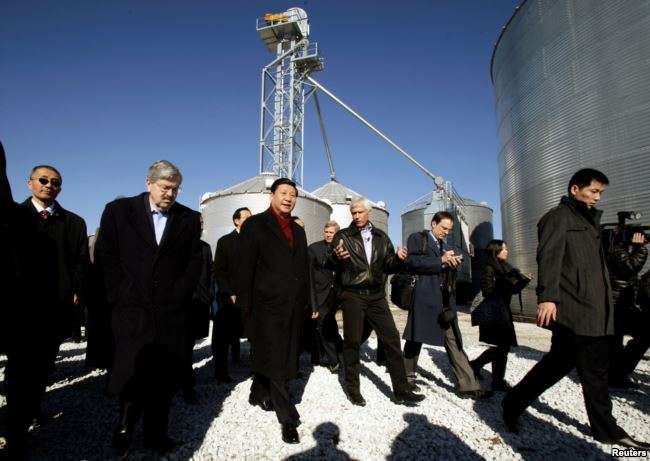 2012年2月16日中国副主席习近平在美国爱奥华州马克斯韦尔的金伯利农场参观时,与州长布兰斯塔德交谈。