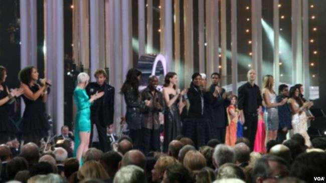好莱坞影星丹泽尔.华盛顿和安妮.海瑟威为包括挪威国王和王后在内的座无虚席的观众联袂主持祝贺刘晓波获得诺贝尔和平奖的音乐盛会。(2010年12月11日)